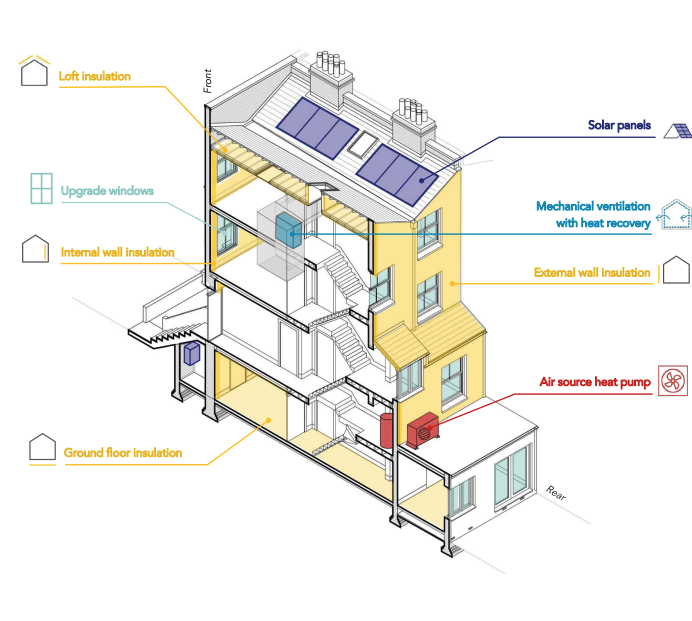 Figure 3. Potential retrofit steps in a Victorian terraced house. Illustration taken from Part 2a Victorian House: A retrofit guide for residents, ESSA local conservation association website: https://files.websitebuilder.prositehosting.co.uk/ae/fc/aefc33f7-d928-4a7c-88d1-a29bf28b3e57.pdf