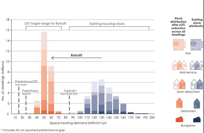Figure 1. Total number of UK dwellings broken down by their space heating demand, showing the transition required from existing levels of high demand to the LETI retrofit target range. Figure based on stock modelling carried out by LETI.